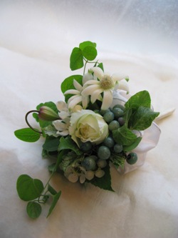 (↑の写真は新郎さまの胸に、ブートニア。↓は新婦さまの手に、ブーケ。)