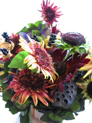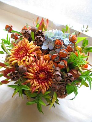 (写真は展示会のお祝いアレンジ。ゲットウの実、マム、秋色あじさい、