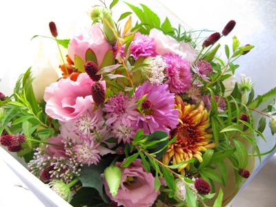 ↓の写真も敬老の日ブーケ。コスモス、トルコギキョウ「サクラダブル」、