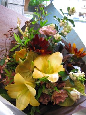 (写真は誕生日のお祝いブーケ。ゆり「サルタレロ」、シンフォリカルポス、