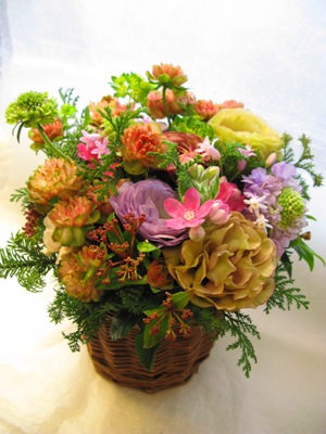 (写真はお正月アレンジ。ご自宅用。マム「クラシックココア」・「シルキーガール」、