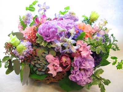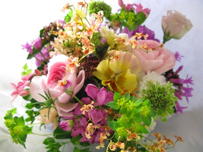 トルコギキョウ、カーネーション「ミルクティ」、ブプレリウム、ツルバキア など。)