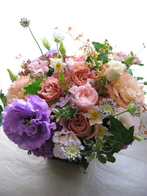 (写真はお供えアレンジ。バラ「カフェラテ」、トルコギキョウ「エグゼラベンダー」、水仙、