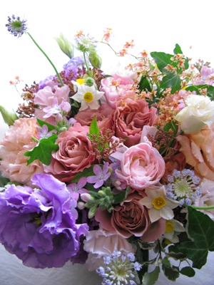 (写真は送別用ブーケ。バラ、スカビオサ、キルタンサス、マトリカリヤ、ガマズミ、