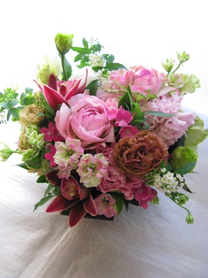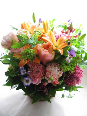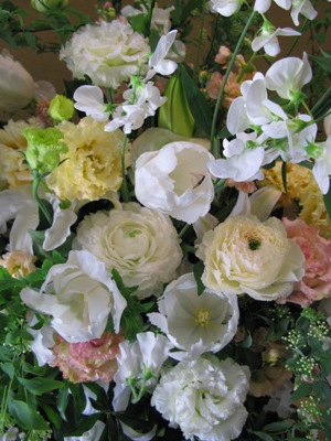 (写真はお供えアレンジ。チューリップ、コデマリ、ラナンキュラス、