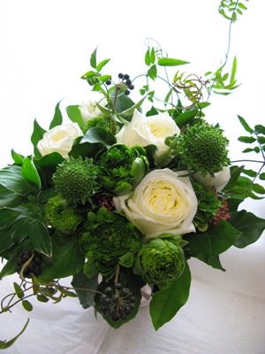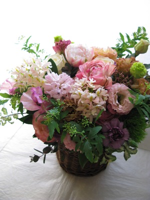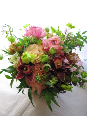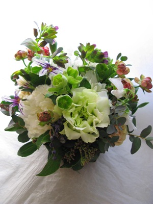 (写真はお任せでつくらせていただいたアレンジ。リューココリネ、スカビオサ、