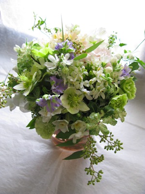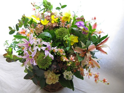 アルストロメリア、セリンセ、水仙、コデマリ、カーネーション「ミルクティ」、