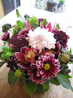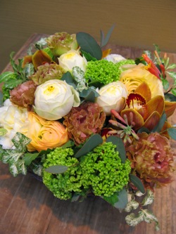 (写真は個展お祝いアレンジ。スカビオサ2種類、シンビジウム、