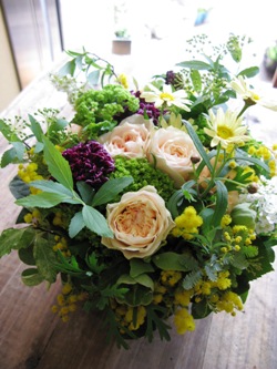 (写真はお祝いアレンジ。バラ「M-カントリーボーイ」、秋色あじさい、