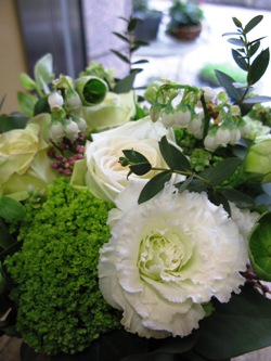 (写真は”お世話になりました”アレンジ。バラ「グリーンティ」、