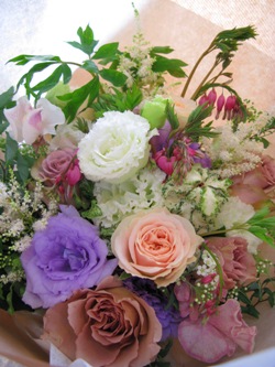 (写真は送別用ブーケ。バラ「ジュリア」・「イプノーズ」、「ペオニーピンク」、