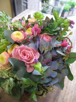 (写真は送別用ブーケ。ヒヤシンス、トルコギキョウ、ラナンキュラス、