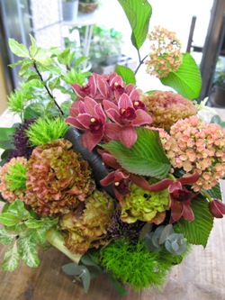 (写真はお供えアレンジ。シンビジウム「フォアゴットンフルーツ」、